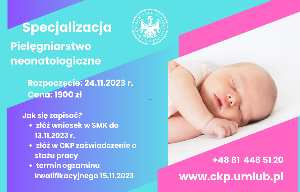 W dniu 15 listopada 2023 r. godz. 11.30 w auli Collegium Pharmaceuticum ul. Chodźki 4a odbędzie się egzamin kwalifikacyjny na specjalizację w dziedzinie pielęgniarstwa neonatologicznego.